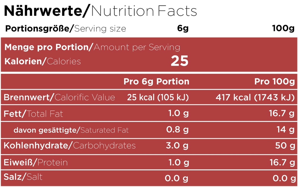 Frei von künstlichen Zusätzen. Vegan & keto-freundlich. Kühl, trocken und luftdicht lagern.
