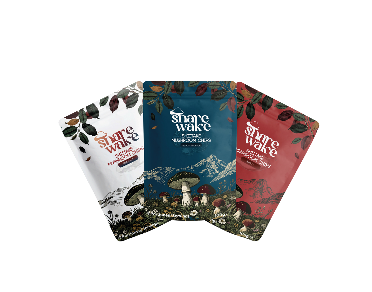 Deine Lieferung umfasst insgesamt drei 100g-Standbodenbeutel unserer innovativen Mushroom Shiitake Chips: