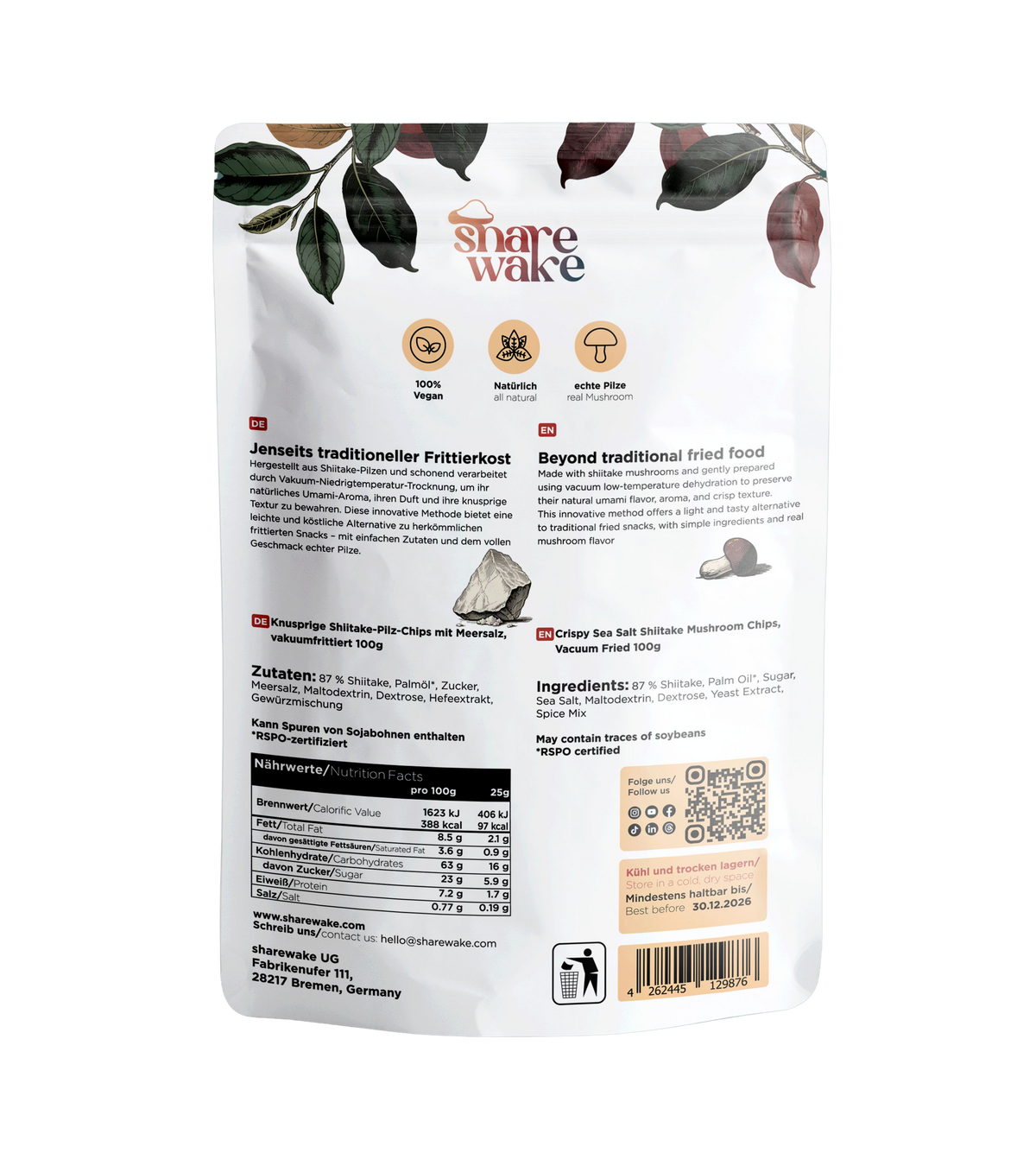 Innovative Textur: Schonend verarbeitet, um die natürliche Form und den maximalen Crunch des Shiitake-Pilzes zu bewahren.